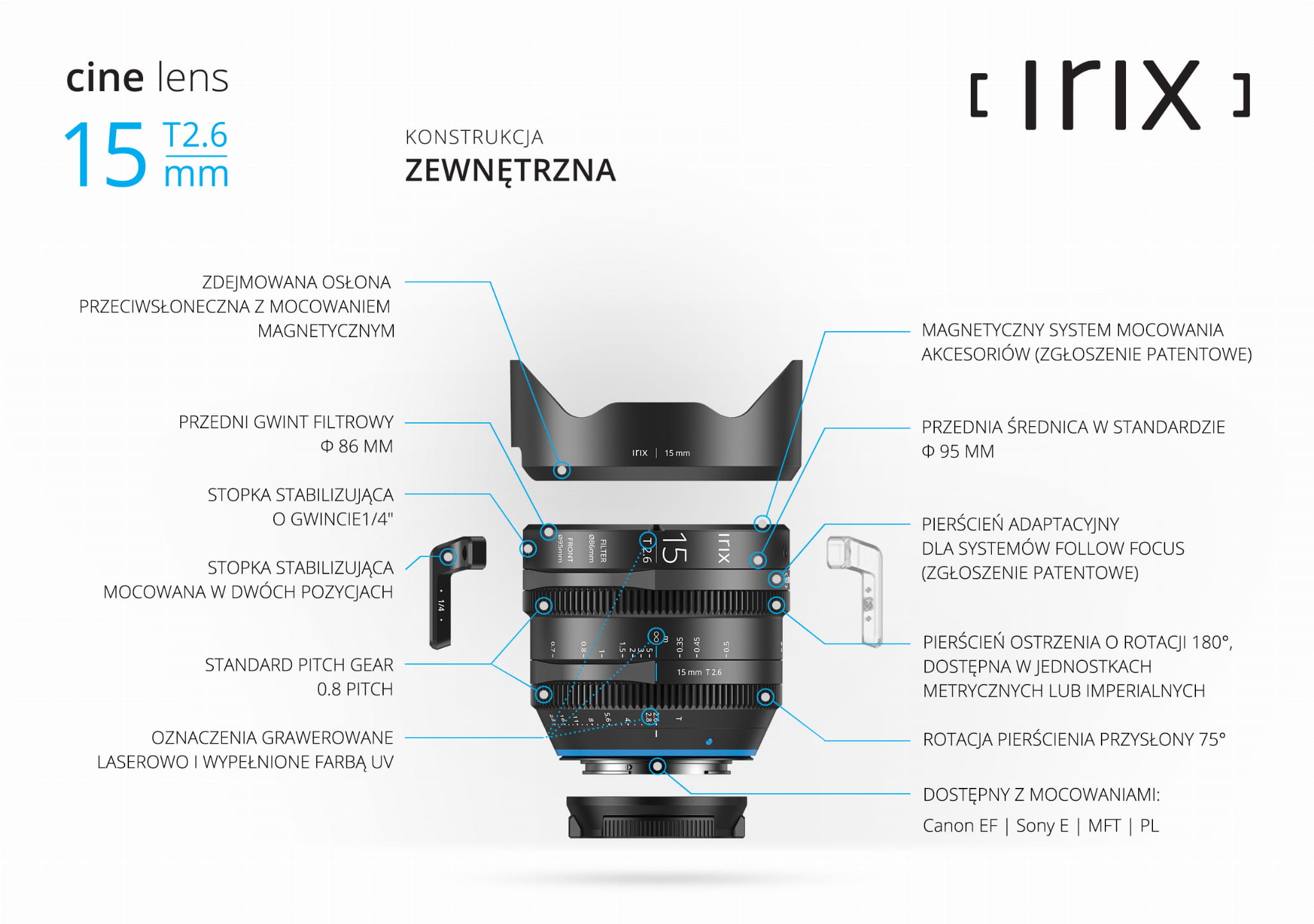 Element przedni jest wyposażony w system magnetyczny do szybkiej wymiany akcesoriów i filtrów. Opatentowane inteligentne rozwiązania sprawiają, że rozwiązania zastosowane w obiektywach Irix są wyjątkowe na rynku.